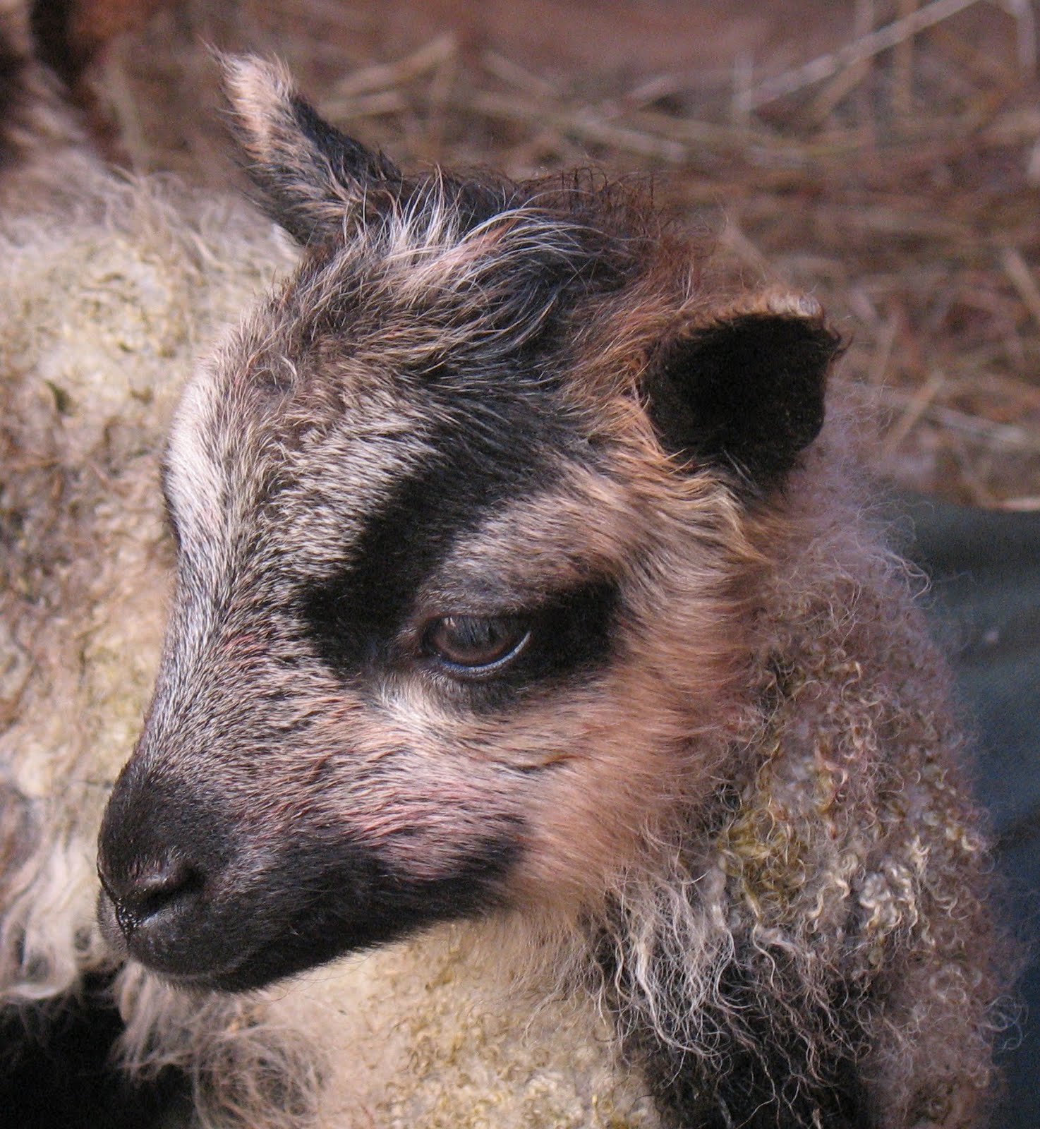 The light one seems to have some facial spotting. The dark one has what I think is the "dog hair" coat that some shepherds have mentioned seeing in lambs. That is the first time I've seen it here. Both have distinct horn buds so they do not have a future in my flock. But I'm happy to get two healthy lambs!